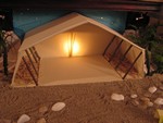 Prés de la tente qui reste dans l’attente …le décor est « planté » : santons, moutons, maisons que les enfants ont réalisés. Au centre la « porte » symbole de notre ouverture sur les autres ; la porte de notre cœur pour laisser entrer Jésus…