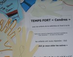 Ils ont dessiné leurs mains sur du papier de couleur puis ont écrit des mots de partage, de solidarité. Ce qu’ils veulent, peuvent faire dans leurs vies d’enfants.